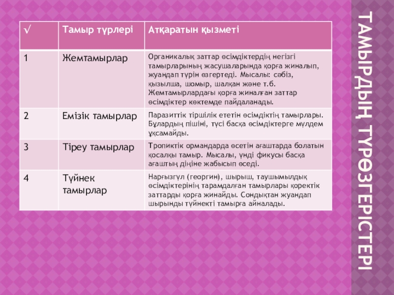 Тамыр –өсімдіктің жер асты мүшесі. Қызметі:а)тамыр – топырақтан сіңірілген суд және онда еріген минералдарды тұздарды сабаққа өткізеді.ә) өсімдіктерді топыраққа берік орнықтырады. б)қоректік заттарды қорға жинайды (сәбіз, қылша. Шалқан, шомыр және т.б.) в)көбеюге қатысады.