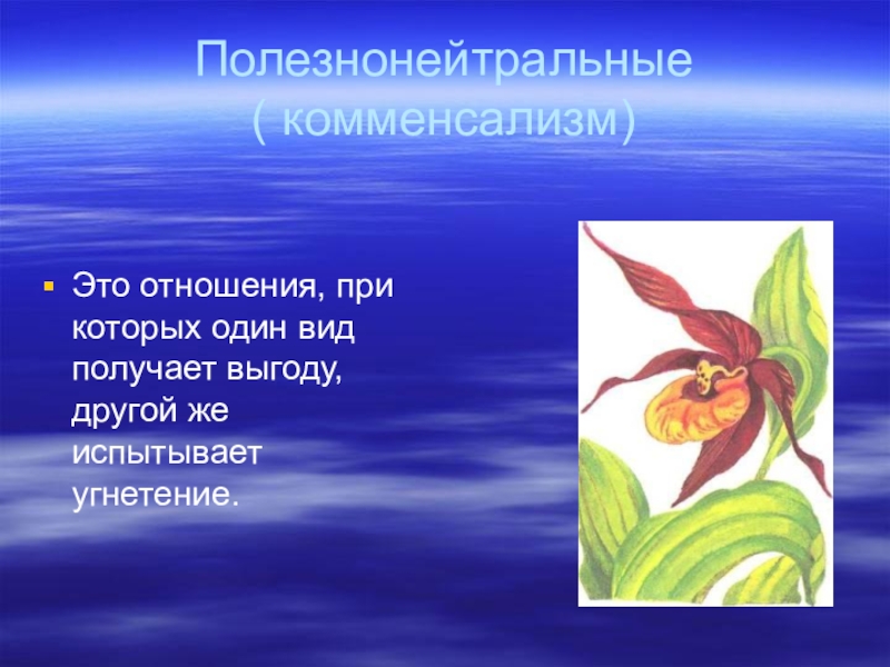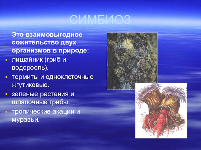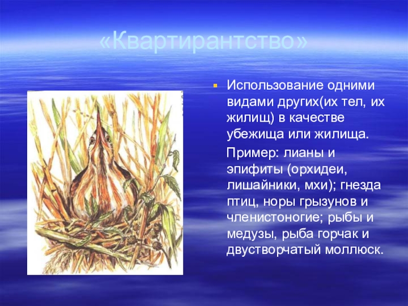Пример: лианы и эпифиты (орхидеи, лишайники, мхи); гнезда птиц, норы грызунов и членистоногие; рыбы и медузы, рыба горчак и двустворчатый моллюск.