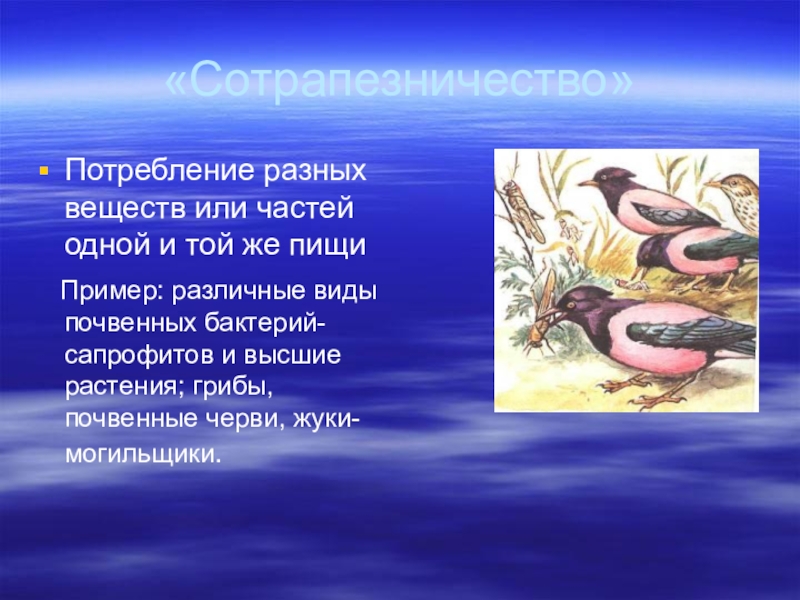 Пример: различные виды почвенных бактерий-сапрофитов и высшие растения; грибы, почвенные черви, жуки-могильщики.