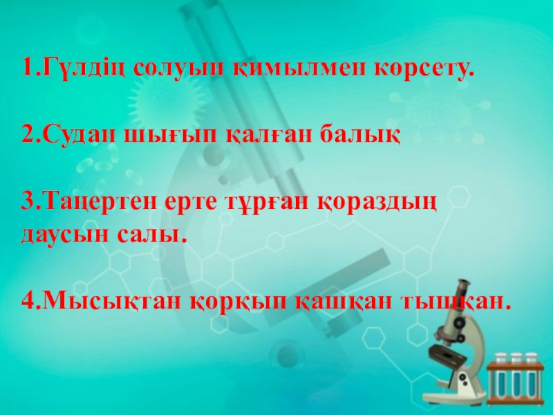 1.Гүлдің солуын қимылмен көрсету.2.Судан шығып қалған балық3.Таңертен ерте тұрған қораздың даусын салы.4.Мысықтан қорқып қашқан тышқан.