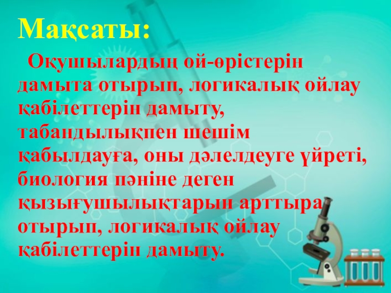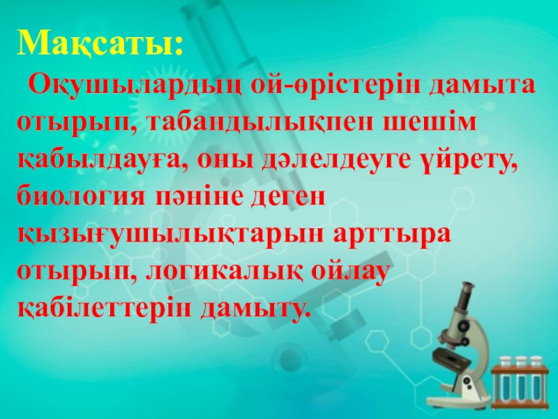 Мақсаты: Оқушылардың ой-өрістерін дамыта отырып, логикалық ойлау қабілеттерін дамыту, табандылықпен шешім қабылдауға, оны дәлелдеуге үйреті, биология пәніне