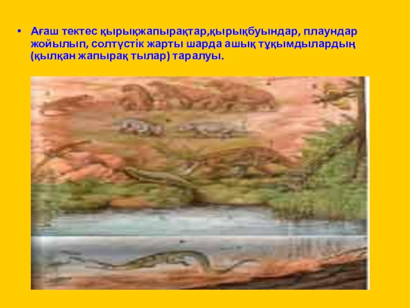 Слайд 12Споралы өсімдіктермен бірге алғашқы ашықтұқымдылар мен мүктәрізділердің пайда болуы.