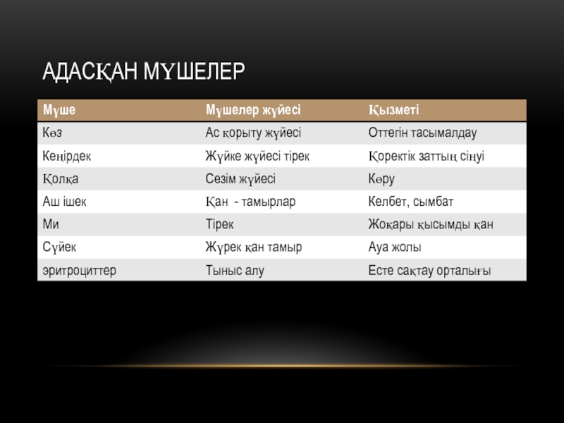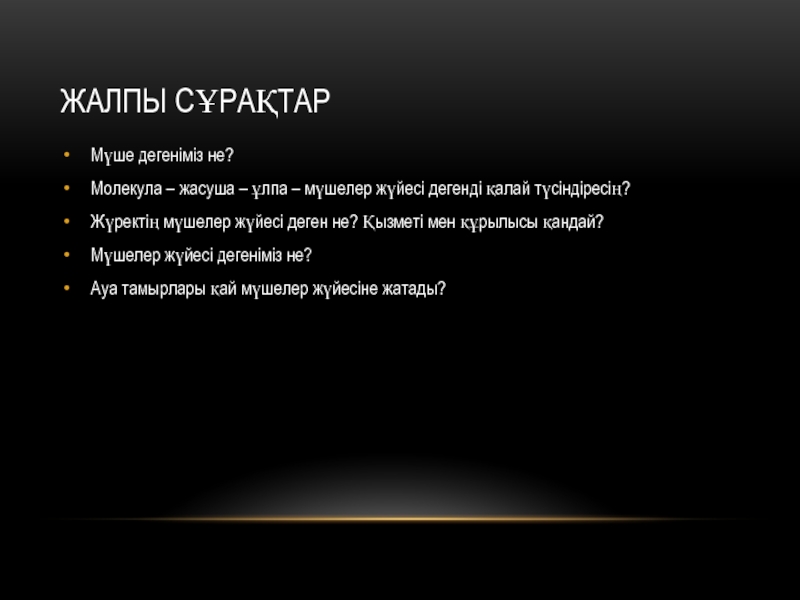 Жалпы сұрақтарМүше дегеніміз не?Молекула – жасуша – ұлпа – мүшелер жүйесі дегенді қалай түсіндіресің?Жүректің мүшелер жүйесі деген не? Қызметі мен құрылысы қандай?Мүшелер жүйесі дегеніміз не?Ауа тамырлары қай мүшелер жүйесіне жатады?