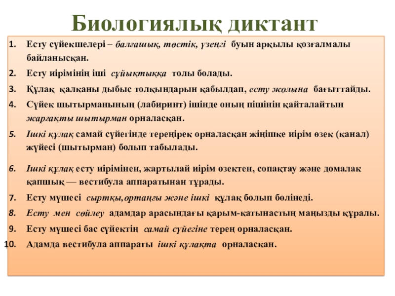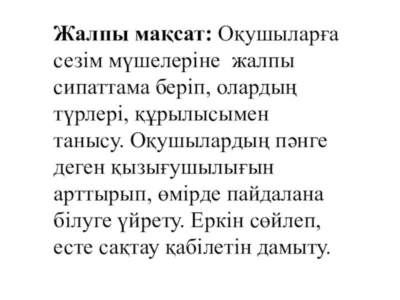 Жалпы мақсат: Оқушыларға сезім мүшелеріне жалпы сипаттама беріп, олардың түрлері, құрылысымен танысу. Оқушылардың пәнге деген қызығушылығын арттырып, өмірде пайдалана білуге үйрету. Еркін сөйлеп, есте сақтау қабілетін дамыту.