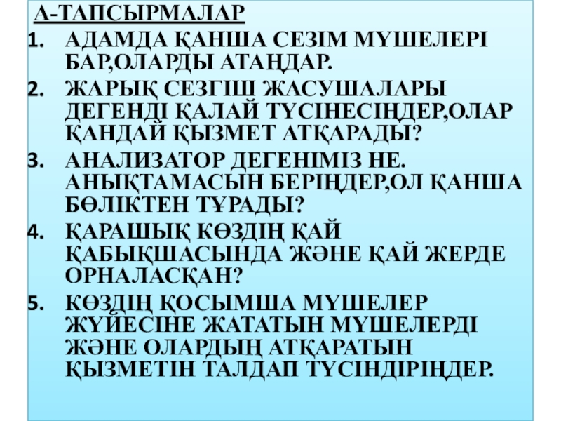 Адамда қанша сезім мүшелері бар,оларды атаңдар.