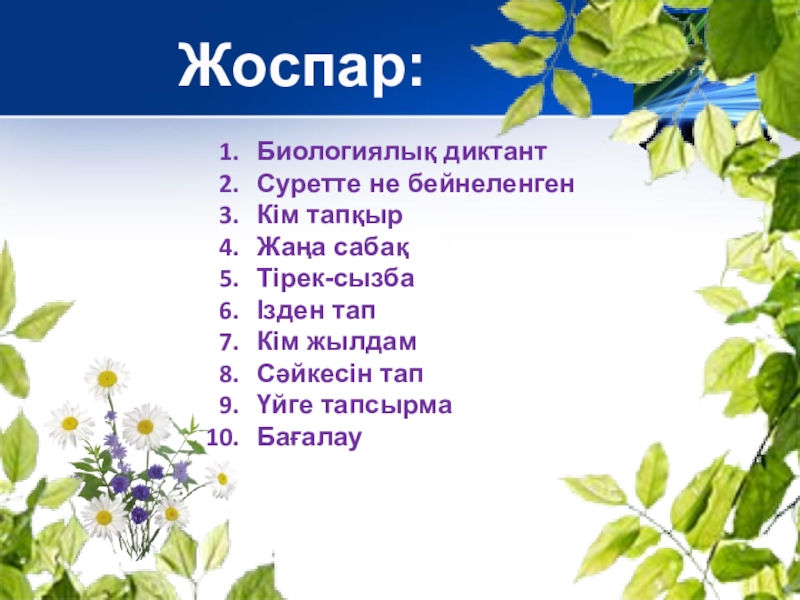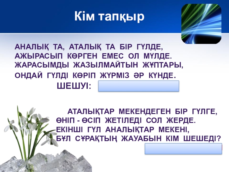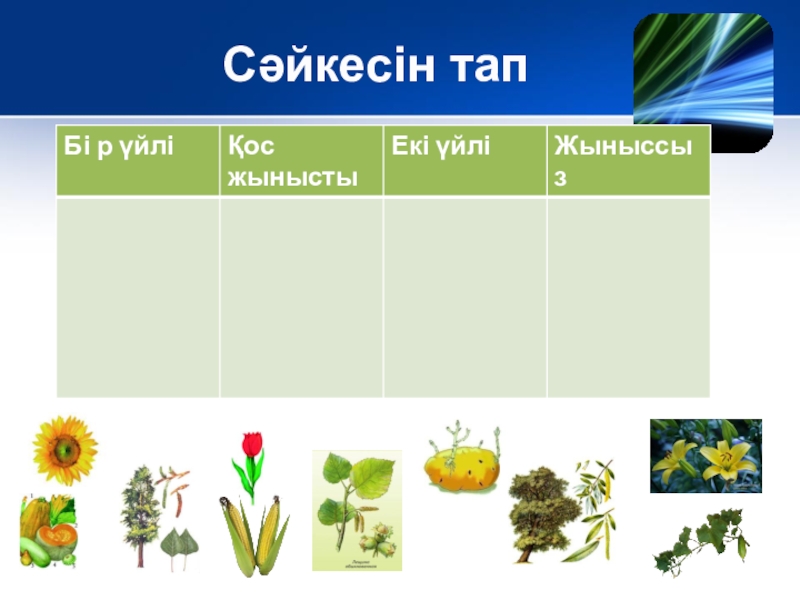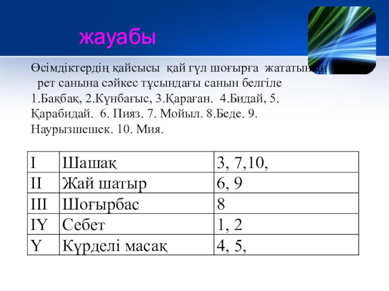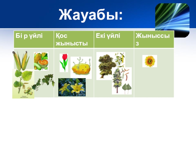 Кілті: 1. Аталық ,аналықты; 2.табанына; 3.гүлсеріксіз гүлдер.4.Аталық, аналық