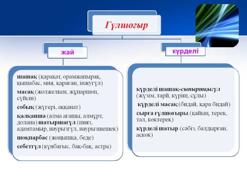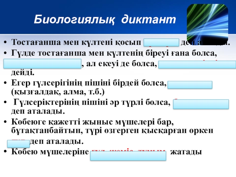 7. ..... көбінесе жасыл түсті, гүлдің сыртында бірікпеген жеке немесе біріккен жапырақшалардан тұрады. 8. ..... сыртқы және ішкі қабықшасы бар жасуша. 9. .....гүлдің жеміс түзуге қатысатын негізгі бөлімі, гүлдің дәл ортасында орналасады. 10.Гүл жазықтығында бірнеше сызық жүргізгенде теңдей бөлікке бөлінсе ...... деп аталады. 11.Әрбір аталық -.... ...... және ..... тұрады.