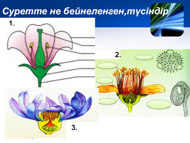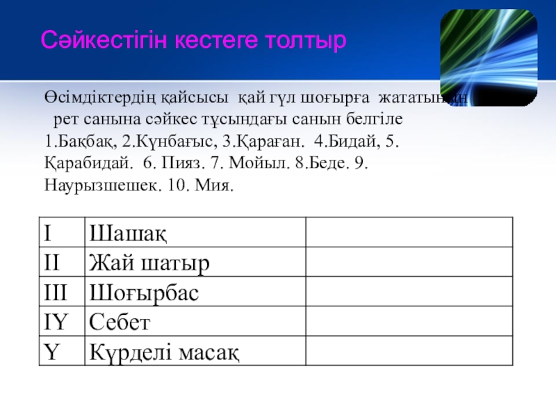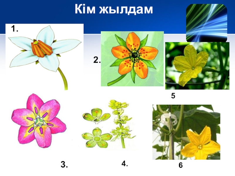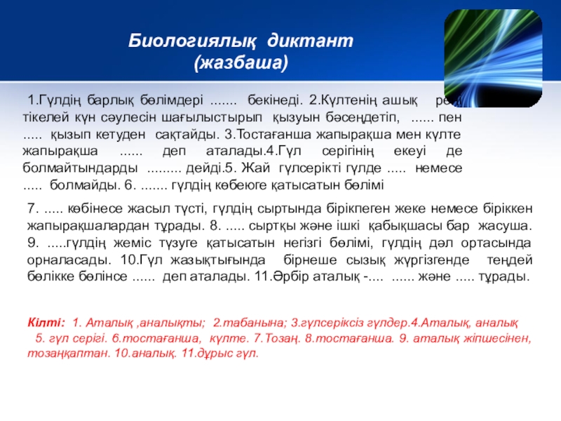 5. гүл серігі. 6.тостағанша, күлте. 7.Тозаң. 8.тостағанша. 9. аталық жіпшесінен, тозаңқаптан. 10.аналық. 11.дұрыс гүл.