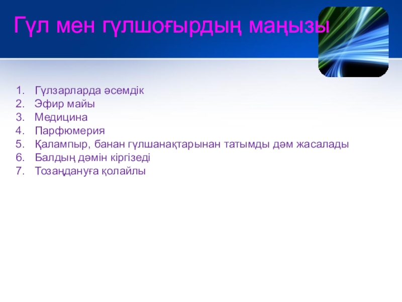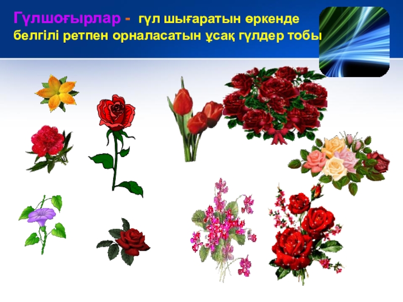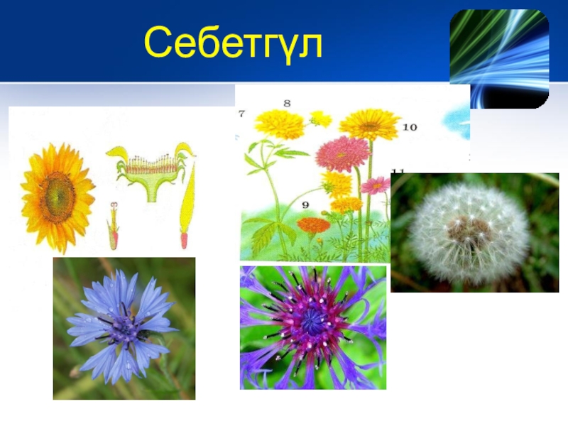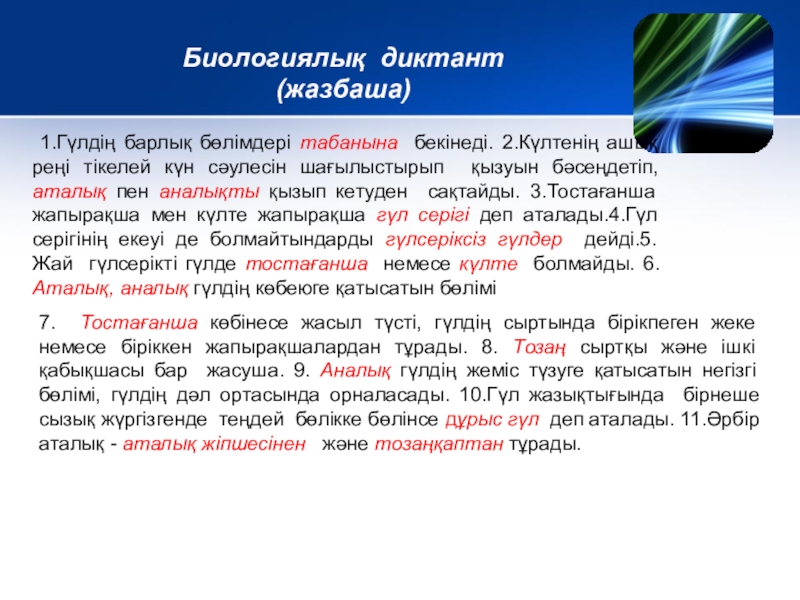 7. Тостағанша көбінесе жасыл түсті, гүлдің сыртында бірікпеген жеке немесе біріккен жапырақшалардан тұрады. 8. Тозаң сыртқы және ішкі қабықшасы бар жасуша. 9. Аналық гүлдің жеміс түзуге қатысатын негізгі бөлімі, гүлдің дәл ортасында орналасады. 10.Гүл жазықтығында бірнеше сызық жүргізгенде теңдей бөлікке бөлінсе дұрыс гүл деп аталады. 11.Әрбір аталық - аталық жіпшесінен және тозаңқаптан тұрады.