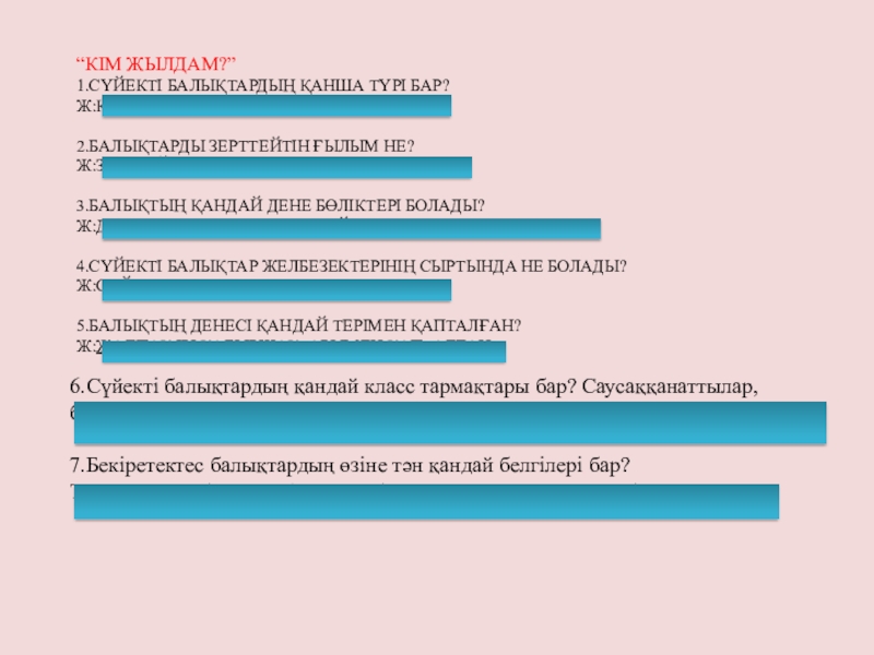2. Оқушыларға балықтың түрлері, отрядтары жөнінде ұғым бере отырып, ой - өрісін, іздену қабілетін дамыту.