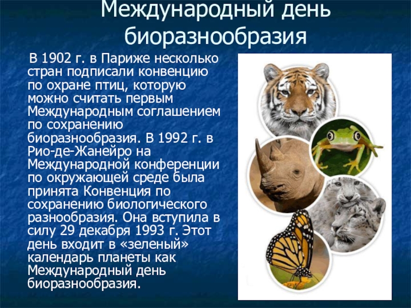 подписали конвенцию по охране птиц, которую можно считать первым Международным соглашением по сохранению биоразнообразия. В 1992 г. в Рио-де-Жанейро на Международной конференции по окружающей среде была принята Конвенция по сохранению биологического разнообразия. Она вступила в силу 29 декабря 1993 г. Этот день входит в «зеленый» календарь планеты как Международный день биоразнообразия.
