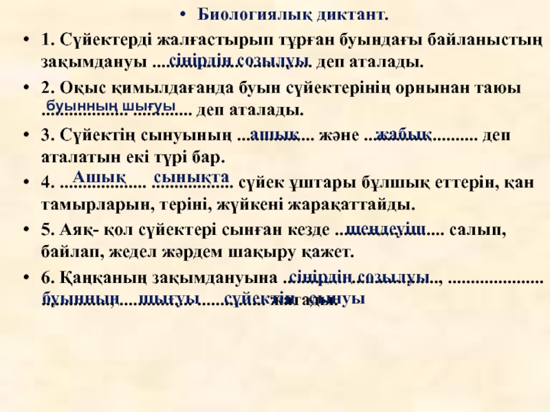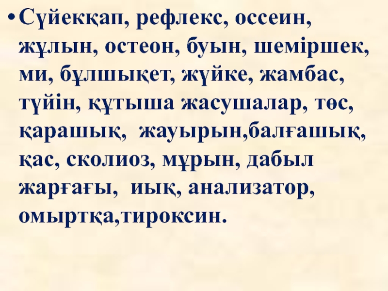 Слайд 8Сүйекқап, рефлекс, оссеин, жұлын, остеон, буын, шеміршек, ми, бұлшықет, жүйке, жамбас,
