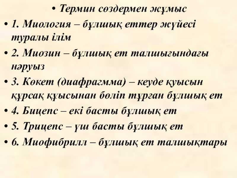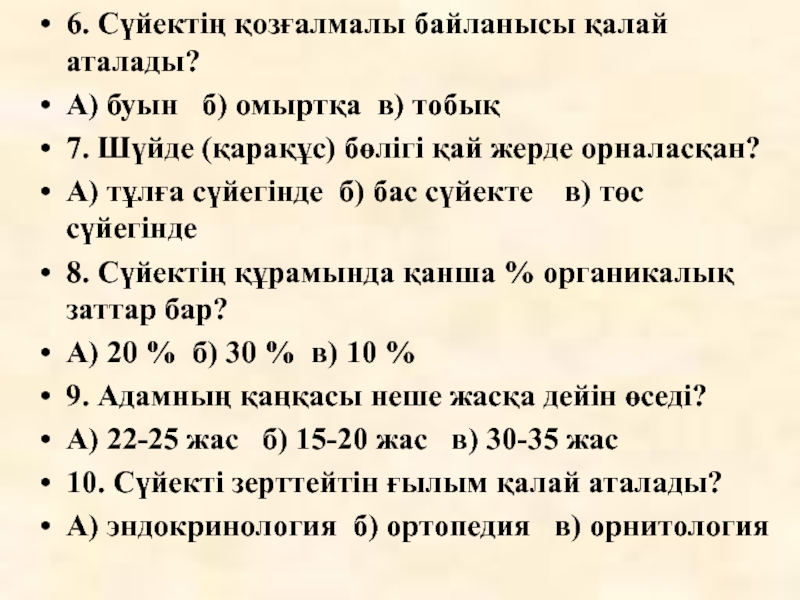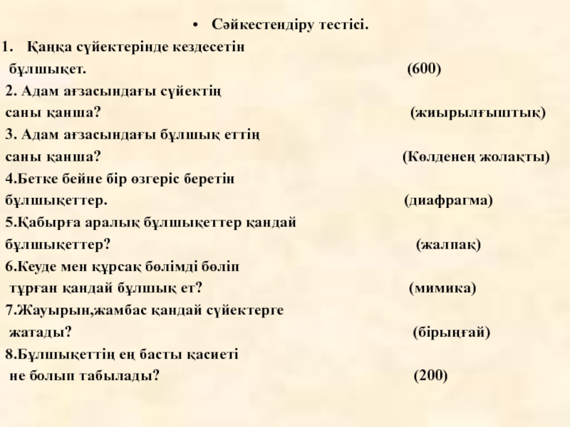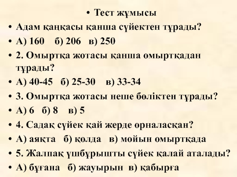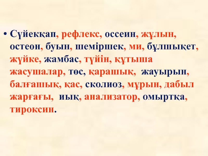түйін, құтыша жасушалар, төс, қарашық, жауырын,балғашық, қас, сколиоз, мұрын, дабыл жарғағы, иық, анализатор, омыртқа,тироксин.