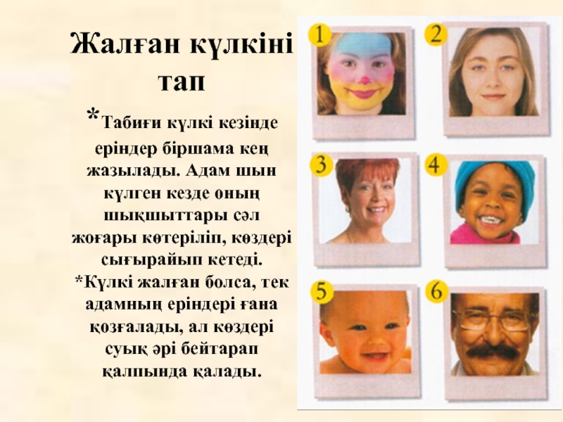 *Күлкі жалған болса, тек адамның еріндері ғана қозғалады, ал көздері суық әрі бейтарап қалпында қалады.
