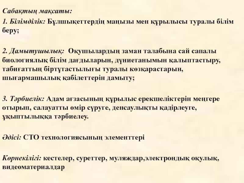 Дамытушылық: Оқушылардың заман талабына сай сапалы биологиялық білім дағдыларын, дүниетанымын қалыптастыру, табиғаттың біртұтастылығы туралы көзқарастарын, шығармашылық қабілеттерін дамыту;