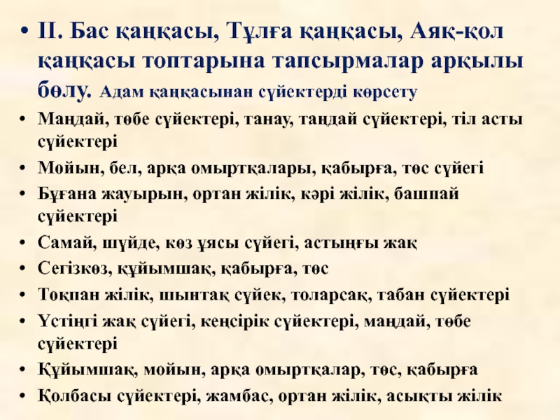 Слайд 4II. Бас қаңқасы, Тұлға қаңқасы, Аяқ-қол қаңқасы топтарына тапсырмалар арқылы бөлу.