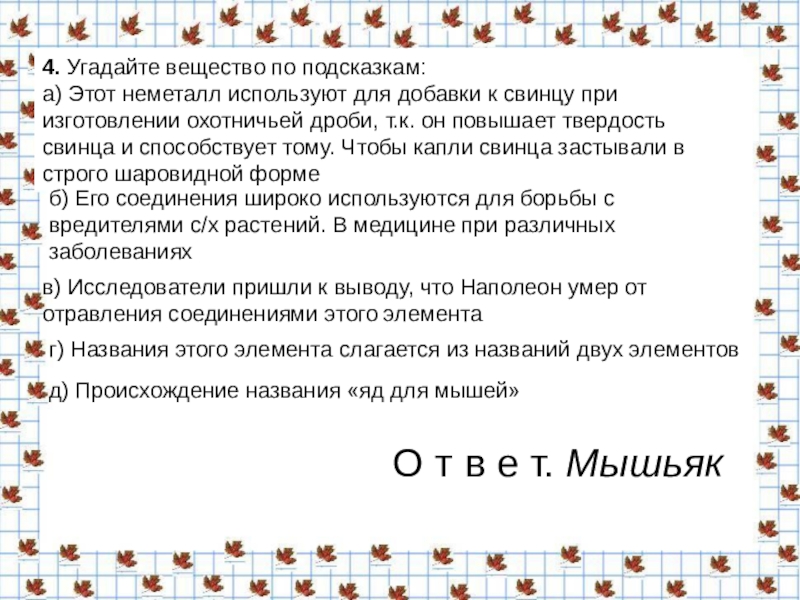 в) Исследователи пришли к выводу, что Наполеон умер от отравления соединениями этого элемента