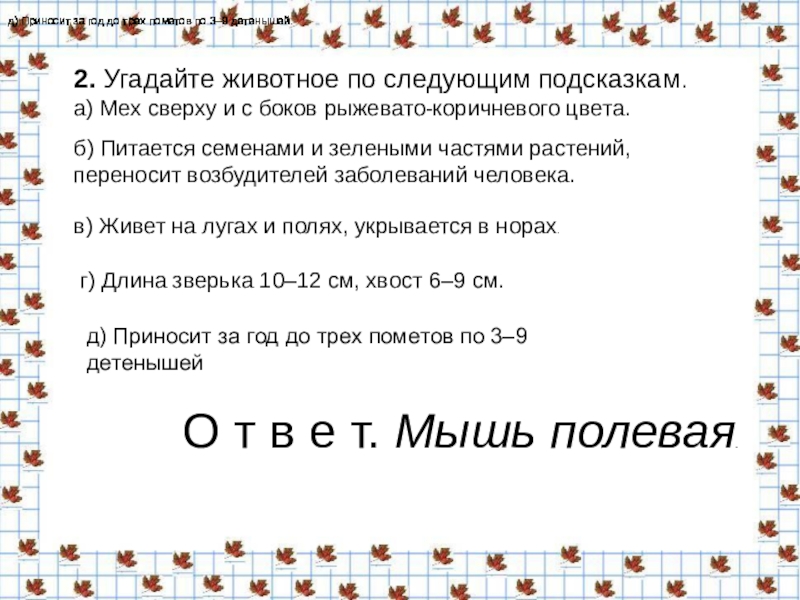г) Длина зверька 10–12 см, хвост 6–9 см.