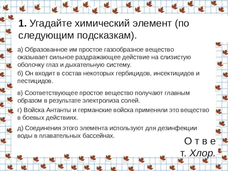 д) Соединения этого элемента используют для дезинфекции воды в плавательных бассейнах.