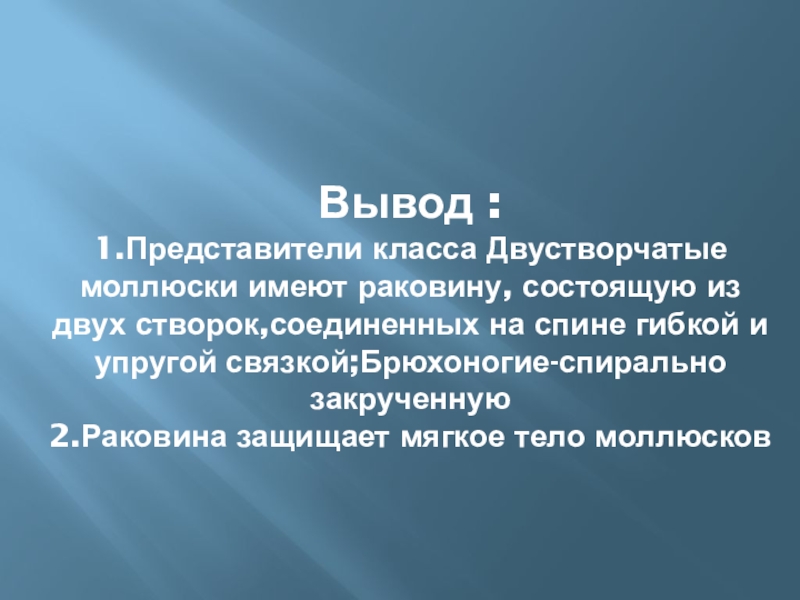 Слайд 9Вывод : 1.Представители класса Двустворчатые моллюски имеют раковину, состоящую из двух створок,соединенных