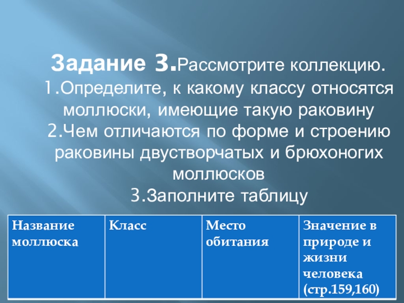 Слайд 7Задание 3.Рассмотрите коллекцию. 1.Определите, к какому классу относятся моллюски, имеющие такую раковину 2.Чем