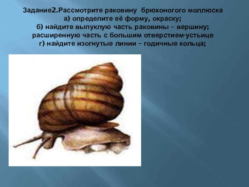 Слайд 6Задание2.Рассмотрите раковину брюхоногого моллюска а) определите её форму, окраску; б) найдите выпуклую часть