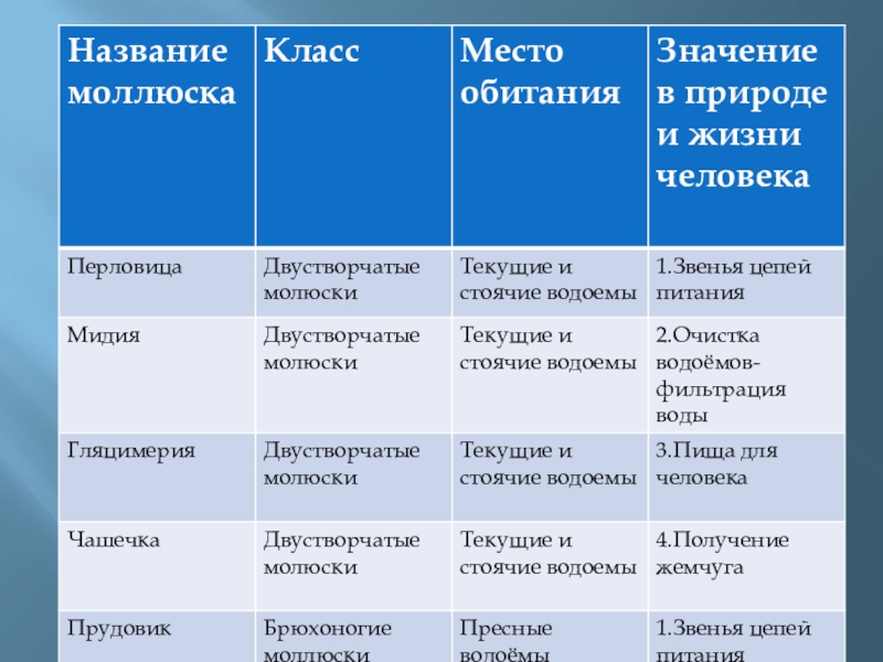 отличаются по форме и строению раковины двустворчатых и брюхоногих моллюсков 3.Заполните таблицу