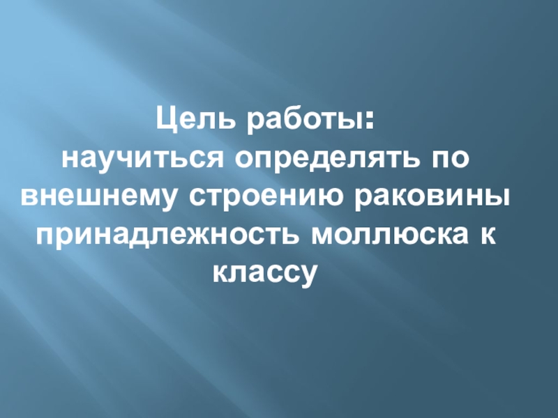 Слайд 4Цель работы: научиться определять по внешнему строению раковины принадлежность моллюска к классу