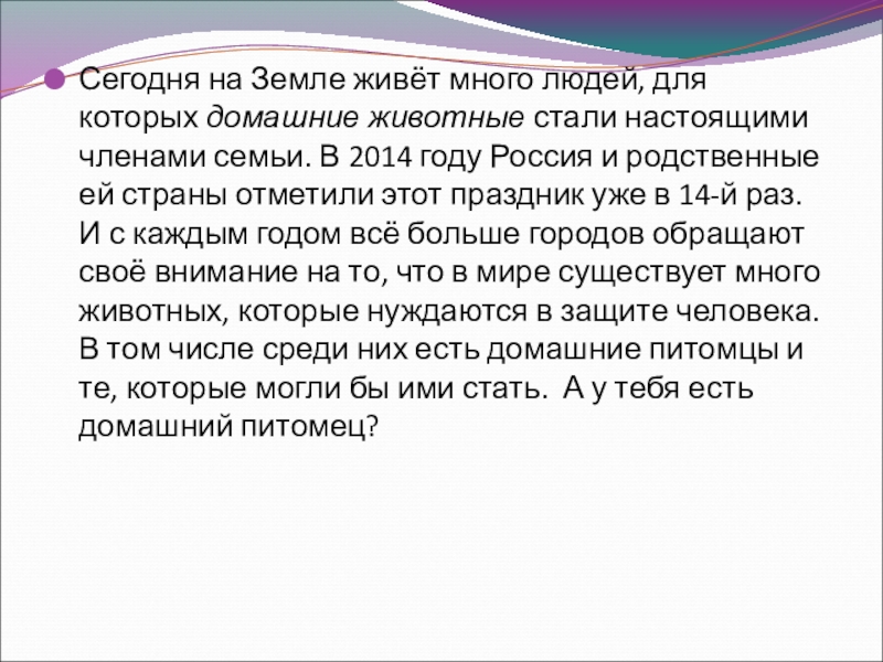 настоящими членами семьи. В 2014 году Россия и родственные ей страны отметили этот праздник уже в 14-й раз. И с каждым годом всё больше городов обращают своё внимание на то, что в мире существует много животных, которые нуждаются в защите человека. В том числе среди них есть домашние питомцы и те, которые могли бы ими стать. А у тебя есть домашний питомец?