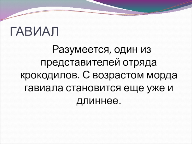 ГАВИАЛ 	 Разумеется, один из представителей отряда крокодилов. С возрастом морда гавиала становится еще уже и длиннее.