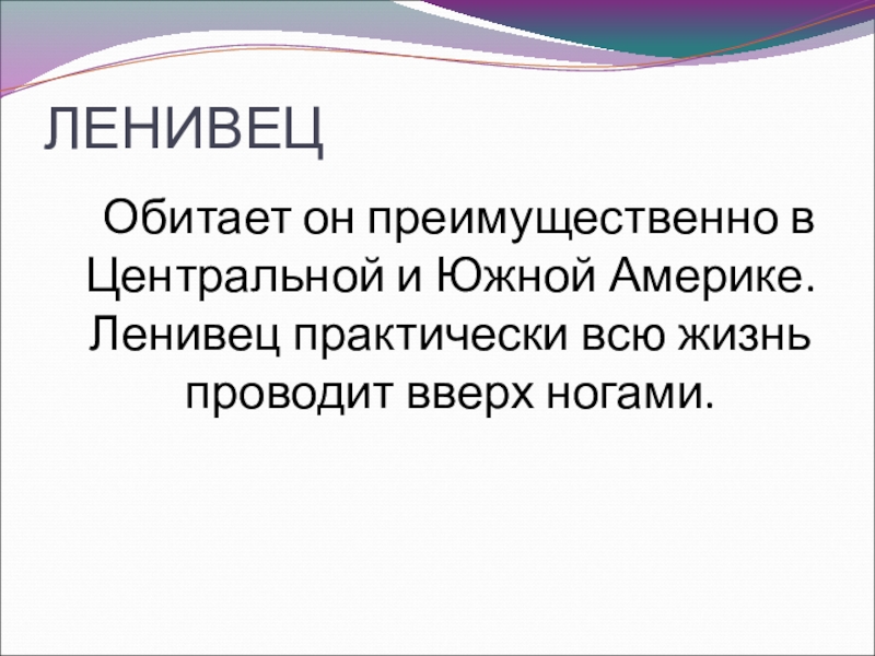 ЛЕНИВЕЦ 	Обитает он преимущественно в Центральной и Южной Америке. Ленивец практически всю жизнь проводит вверх ногами.