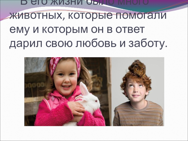 Слайд 3 В его жизни было много животных, которые помогали ему