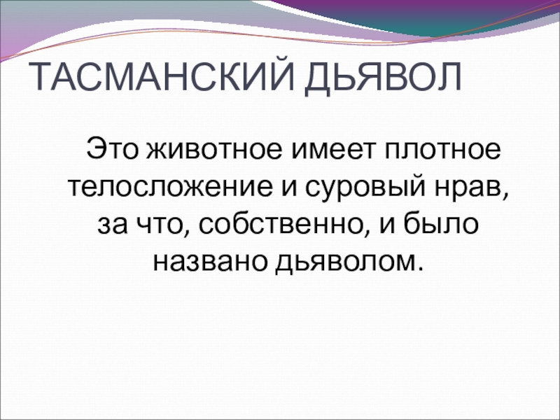 ТАСМАНСКИЙ ДЬЯВОЛ 	Это животное имеет плотное телосложение и суровый нрав, за что, собственно, и было названо дьяволом.