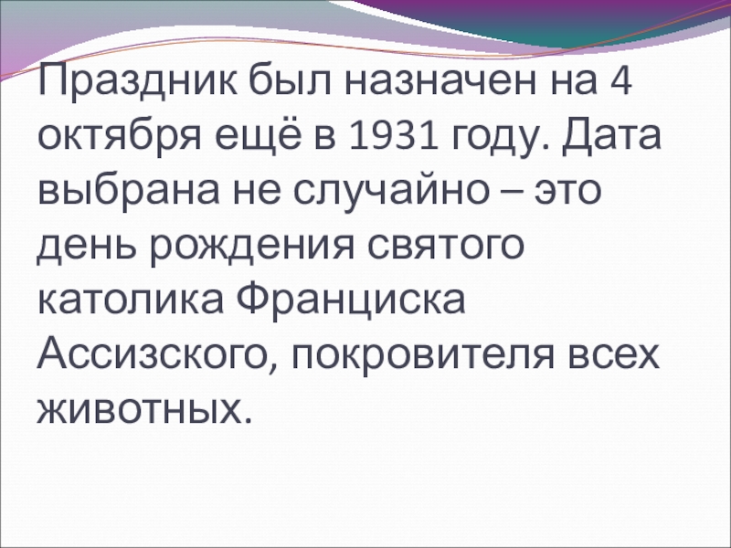 Слайд 2Праздник был назначен на 4 октября ещё в 1931 году. Дата