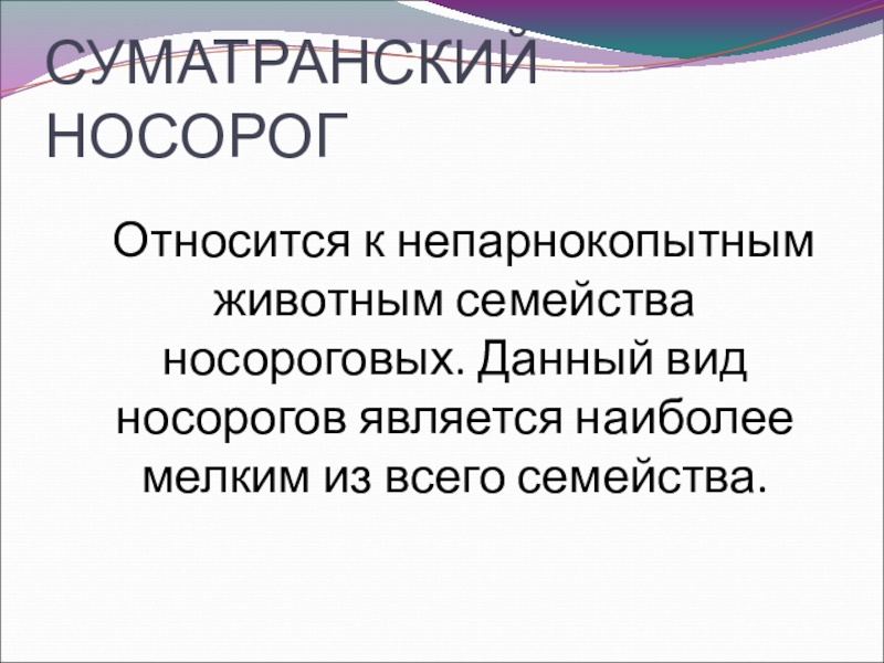 СУМАТРАНСКИЙ НОСОРОГ	Относится к непарнокопытным животным семейства носороговых. Данный вид носорогов является наиболее мелким из всего семейства.