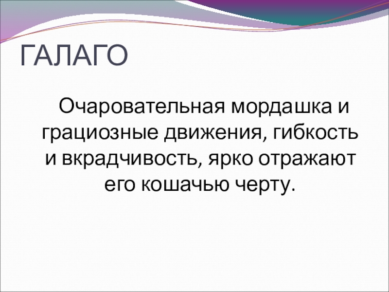 ГАЛАГО 	Очаровательная мордашка и грациозные движения, гибкость и вкрадчивость, ярко отражают его кошачью черту.