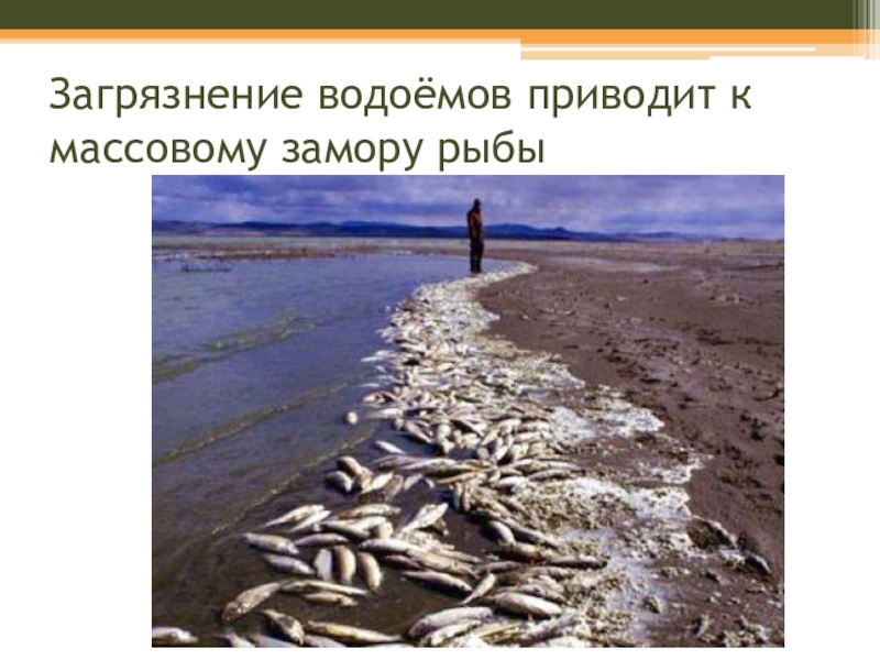 Слайд 9Загрязнение водоёмов приводит к массовому замору рыбы