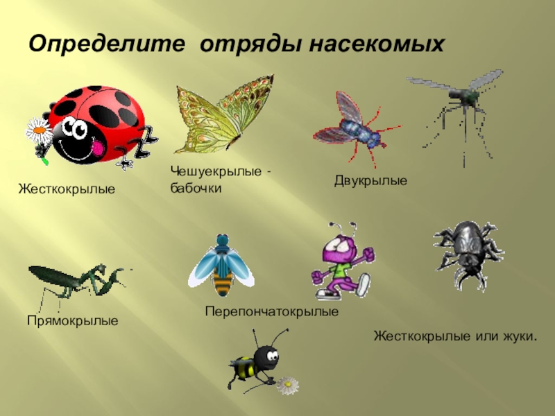Определите отряды насекомыхПрямокрылыеЖесткокрылые Жесткокрылые или жуки.Чешуекрылые - бабочкиПерепончатокрылыеДвукрылые