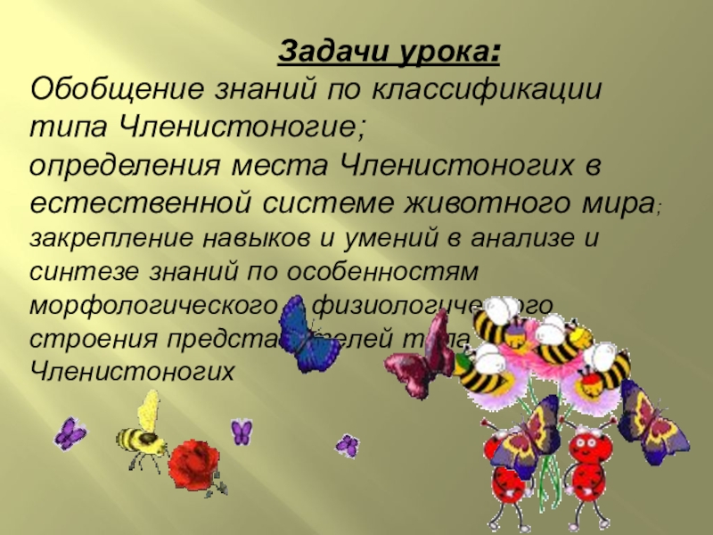 Задачи урока:Обобщение знаний по классификации типа Членистоногие; определения места Членистоногих в естественной системе животного