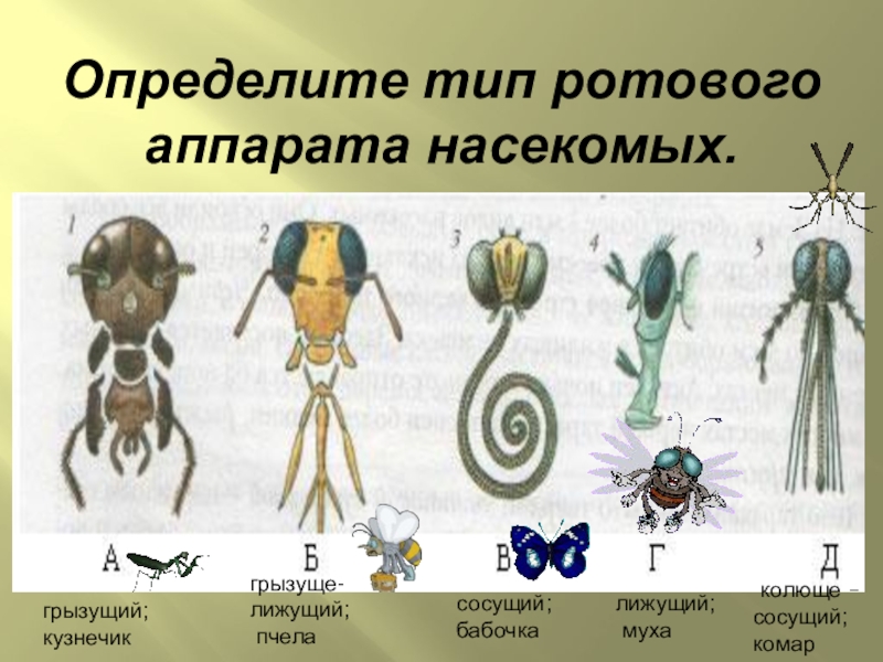 Определите тип ротового аппарата насекомых. грызущий; кузнечикгрызуще-лижущий; пчеласосущий; бабочкалижущий; муха колюще – сосущий; комар