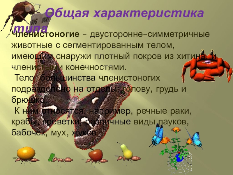 Общая характеристика типаЧленистоногие – двусторонне–симметричные животные с сегментированным телом, имеющим снаружи плотный покров из хитина,