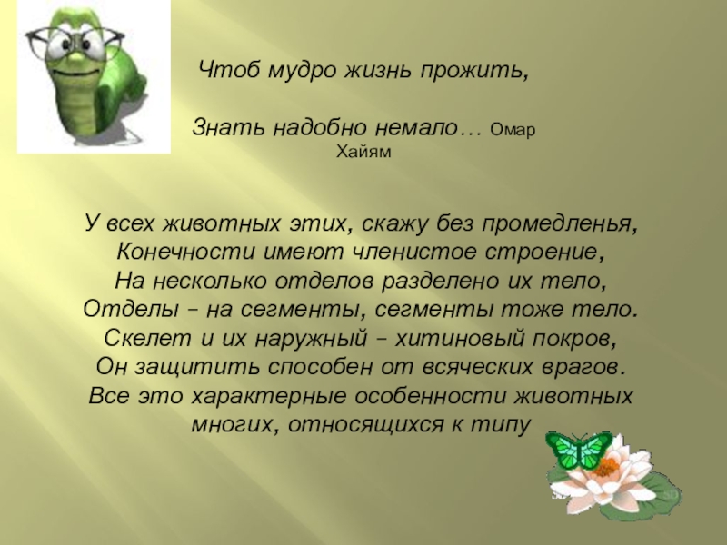 скажу без промедленья, Конечности имеют членистое строение, На несколько отделов разделено их тело, Отделы – на сегменты, сегменты тоже тело. Скелет и их наружный – хитиновый покров, Он защитить способен от всяческих врагов. Все это характерные особенности животных многих, относящихся к типу