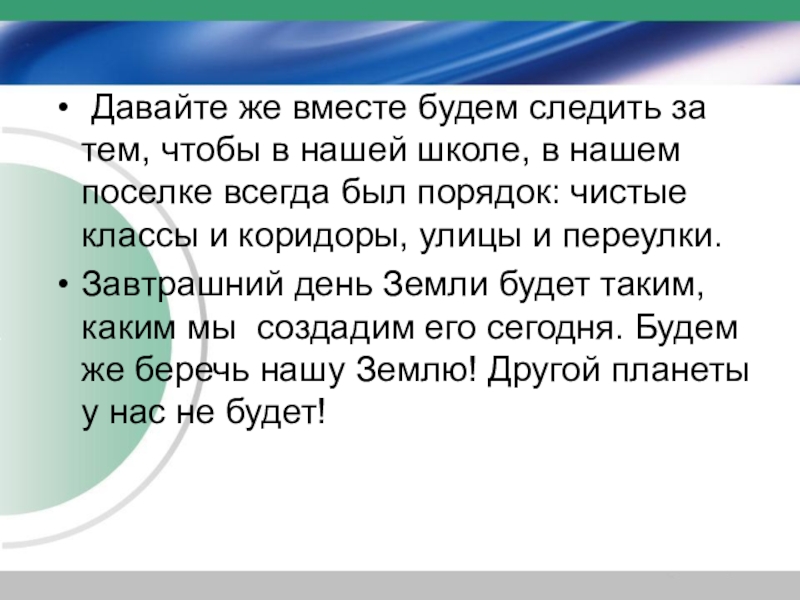Завтрашний день Земли будет таким, каким мы создадим его сегодня. Будем же беречь нашу Землю! Другой планеты у нас не будет!