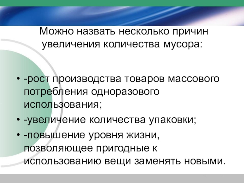 Слайд 5 Можно назвать несколько причин увеличения количества мусора: