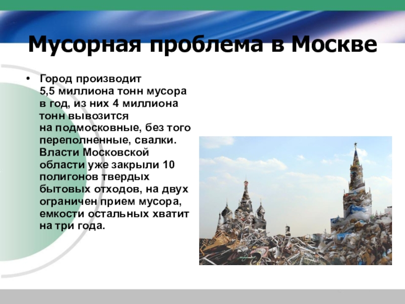 тонн вывозится на подмосковные, без того переполненные, свалки. Власти Московской области уже закрыли 10 полигонов твердых бытовых отходов, на двух ограничен прием мусора, емкости остальных хватит на три года.
