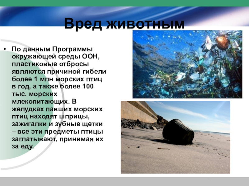 гибели более 1 млн морских птиц в год, а также более 100 тыс. морских млекопитающих. В желудках павших морских птиц находят шприцы, зажигалки и зубные щетки – все эти предметы птицы заглатывают, принимая их за еду.