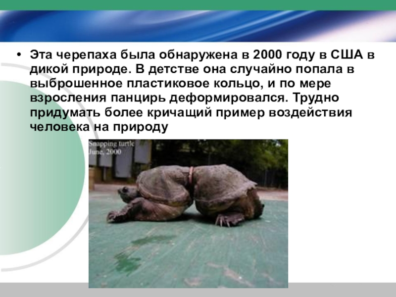 природе. В детстве она случайно попала в выброшенное пластиковое кольцо, и по мере взросления панцирь деформировался. Трудно придумать более кричащий пример воздействия человека на природу