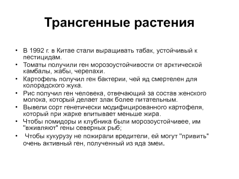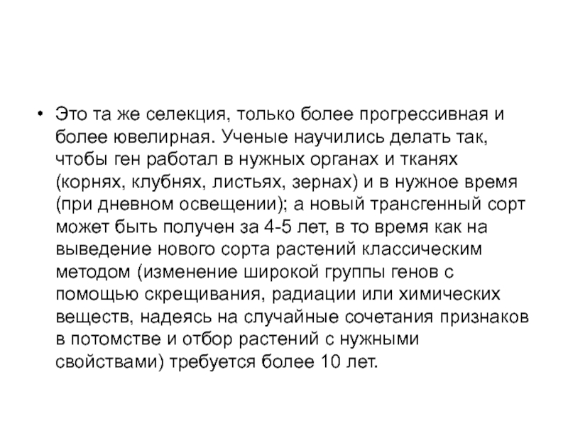 научились делать так, чтобы ген работал в нужных органах и тканях (корнях, клубнях, листьях, зернах) и в нужное время (при дневном освещении); а новый трансгенный сорт может быть получен за 4-5 лет, в то время как на выведение нового сорта растений классическим методом (изменение широкой группы генов с помощью скрещивания, радиации или химических веществ, надеясь на случайные сочетания признаков в потомстве и отбор растений с нужными свойствами) требуется более 10 лет.