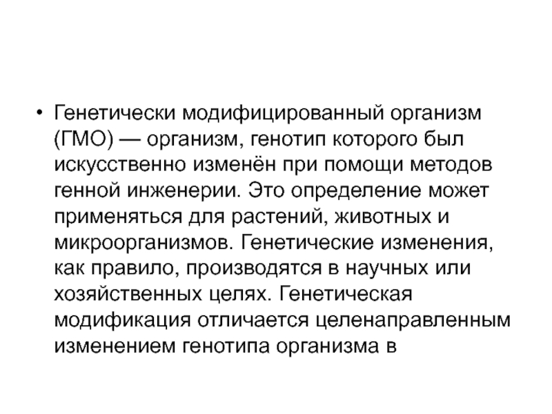 Генетически модифицированный организм (ГМО) — организм, генотип которого был искусственно изменён