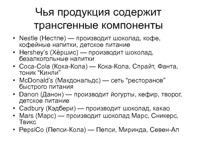 Слайд 37Чья продукция содержит трансгенные компоненты